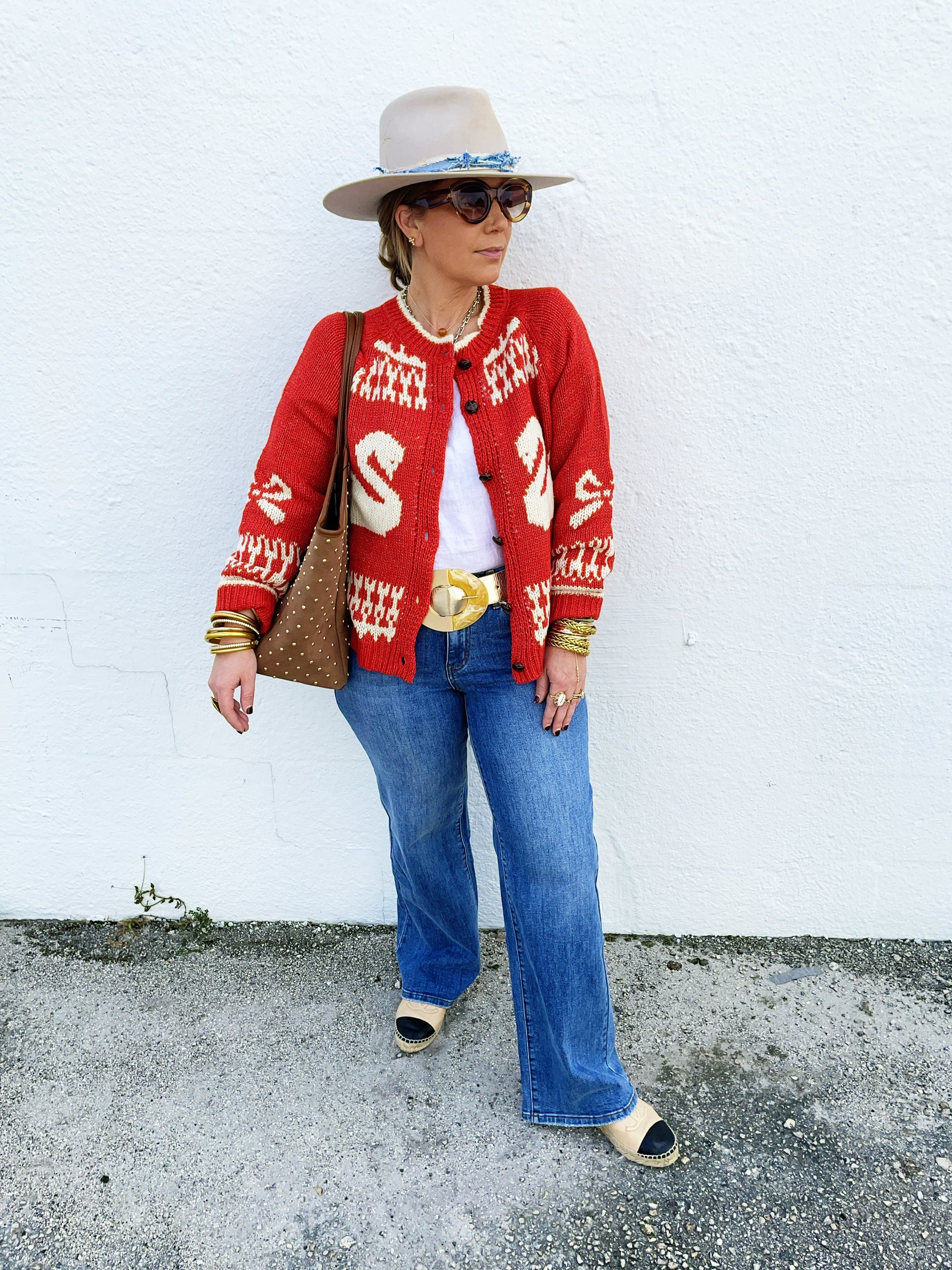 Oversized Graphic Casual Knit Sweater Cardigan - Long Sleeve - Button Down - Ribbed Hem