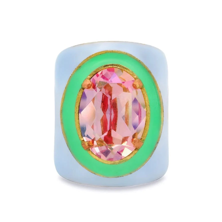 Add a touch of vintage charm with the Mega Dakota Rings in Midnight Express. Featuring antique gold plating and sparkling high-quality crystals, each ring is hand-painted with vibrant enamel for a unique finish. Adjustable to fit comfortably, these rings bring playful elegance to any outfit.