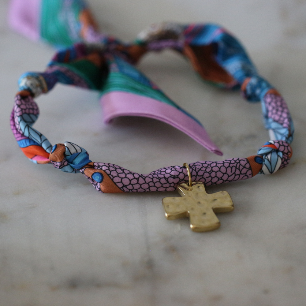 Colorful, textured, and full of life—the River Market Twilly Scarf Necklace brings together bold purples, blues, and greens in a lively print, finished with a hammered gold cross charm. It’s the kind of piece that feels one-of-a-kind—just like the local finds you stumble on in your favorite open-air market.